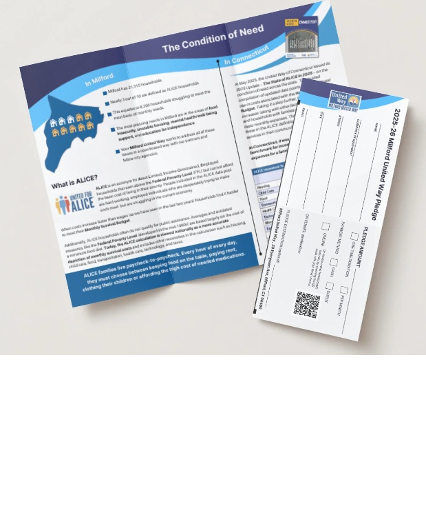 The Condition of Need in our community is eye-opening and you can help us turn it around. Please take a look at the new 2025-26 Milford United Way trifold brochure to learn more. This new brochure includes lots of information about your Milford United Way: what we do, how we help our community, some data and stats, and a pledge card that shows how YOU can help.